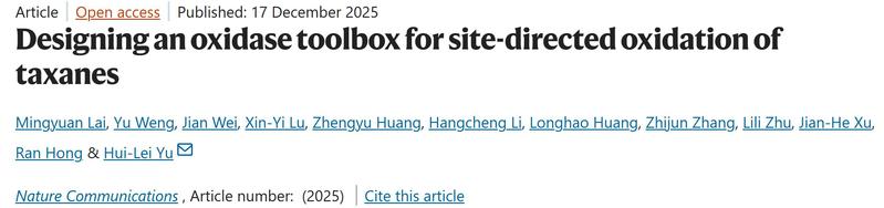 近日,生物工程学院生物催化与合成生物团队郁惠蕾课题组在Nature Communications上发表题为“Designing an oxidase toolbox for site-directed oxidation of taxanes”的研究论文(doi.org/10.1038/s41467-025-67544-4)。该研究成功开发出一种紫杉烷非天然氧化酶工具箱,能够实现紫杉烷骨架 C-4、C-6、C-10、C-11、C-12 和 C-13 位点的区域和立体选择性氧化。该工具箱不仅实现了11个紫杉烷新结构的高效合成,更为人工重构紫杉醇及其类似物的高效合成路线奠定了坚实基础。